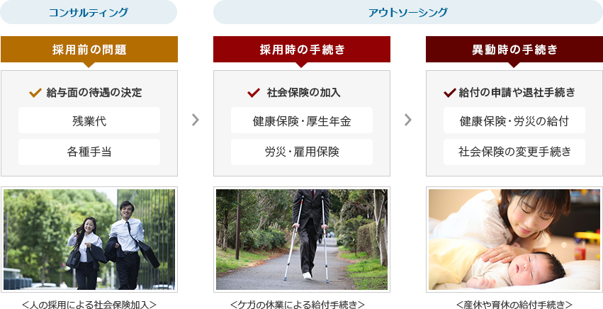 それに伴う社会保険の手続きや毎年の社会保険・労働保険の申告も行います。